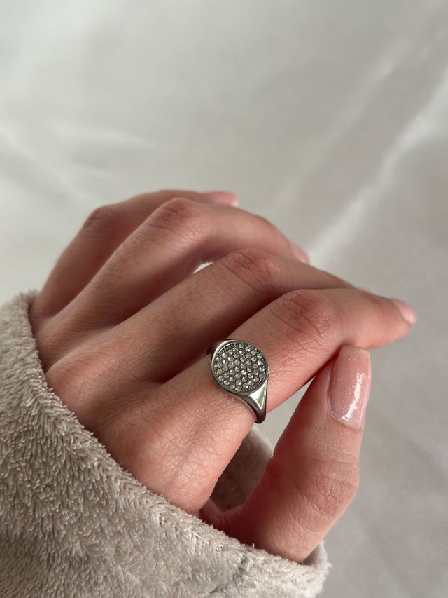 Anel ajustável em aço inoxidável prateado com perdas brilhantes.