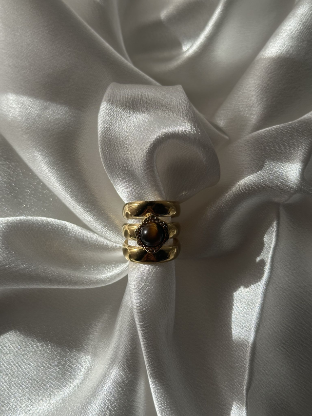 Anel ajustável em aço inoxidável com pedra natural no topo.